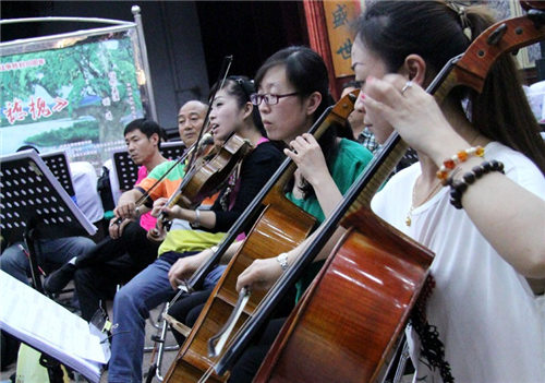 《紫穗槐》文场乐队二弦尤建军(右二)、四弦卢岳军(右一)在修改伴奏