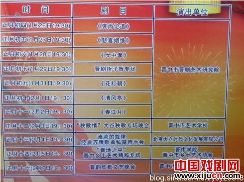 每年春节期间,晋中文化艺术中心都会举办一场名为“十佳春节剧”的活动。今年,从第一个月的4号到第一个月的16号(第一个月的8号和第一个月的5号不可用),每天将有一场演出,总共有11场演出。第一个月11号之前,晋剧是一场特殊的演出,第一个月12号是一场派对形式的演出。以下是计划时间表: