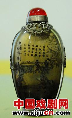根据鼻烟壶收藏家张的说法,鼻烟壶是一个内画鼻烟壶。瓶身制作于清朝光绪年间,主要由琉璃制成。鼻烟壶内层镀金,里面的文字和绘画是著名内画大师叶晓峰创作的。民国十六年(1927年),叶晓峰把鼻烟壶送给京剧大师梅兰芳。