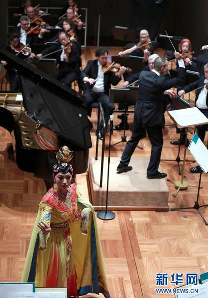 10月13日,在莱茵河畔的路德维希港,京剧梅派的后裔小迪(前)在“谭盾音乐周”上表演了“钢琴交响诗与京剧青衣,霸王别姬”。同一天,音乐家谭盾的《钢琴与京剧交响诗,霸王别姬》在路德维希港的“谭盾音乐周”上在欧洲首映。为期五天的“谭盾音乐周”于10月11日在路德维希港拉开帷幕。新华社记者罗欢欢