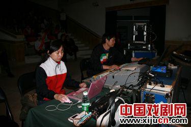 舞蹈美容中心的音响工程师刘郭明和负责字幕工作的高山正在工作