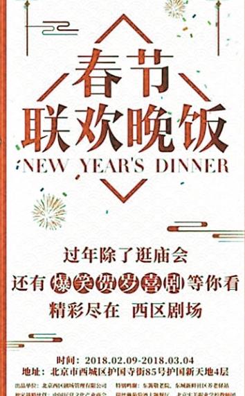 春节期间,北京人民艺术原创京味剧《玩家》将在首都剧场演出5场。整出戏用北京风味的语言生动地表演了“北京的地方,北京的事件,北京的人民,北京的品味”。北京人民艺术剧院的另一部戏剧《我爱桃花》将在人民艺术实验剧院上演。这部戏剧巧妙地利用一个古老的故事在舞台上展现了人类同样的情感困惑和美丽。此外,一年一度的新年喜剧《春节晚宴》将在北京西区剧院上演,继续为观众带来节日的欢乐。