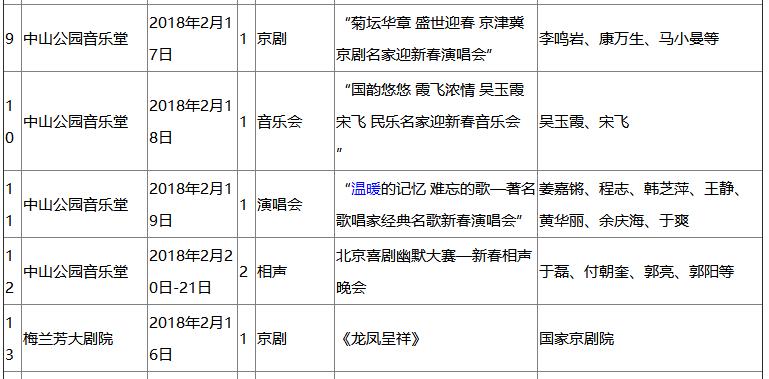 中山公园音乐厅的“2018春节表演季”也即将到来,邀请您庆祝中国传统文化年。农历新年的第一天,胡文阁、张慧芳、朱强等京剧大师带领老幼三代精英唱响中国新年的第一声,表演“国韵、春秋庆典、金流——京剧大师新年音乐会的著名片段”。新年第二天,“莒丹华章史圣迎春京津冀京剧大师春节音乐会”聚集了京津冀京剧表演艺术家。许多京剧大师如李派的老聃·李鸣岩、邱派的华康联·万盛、梅派的青丁毅·小军等都带着感情表演。