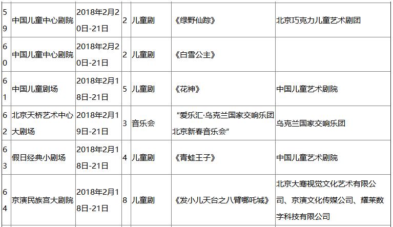 节日期间,北京将汇集许多中外经典哑剧,如《绿野仙踪》、《小红帽》和《哪壶不开提哪壶》,给孩子们一场视觉盛宴。中国木偶艺术剧院将在春节期间安排25场演出,包括木偶剧《皮诺曹》和大型卡通舞台剧《新大头儿子和小脑袋父亲的生日》、《棉花糖》和《新大头儿子和小脑袋父亲的云妈妈》。小钟剧院将上演课程剧《大本狼》和《聪明的小猴子柯小楠》。中国儿童艺术剧院出品的《青蛙王子》、《花神》和《魔方四》将分别在假日经典剧院、中国儿童剧院和国家大剧院上演。
