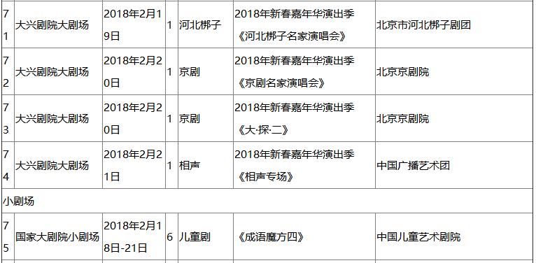 国家京剧剧院将在梅兰芳大剧院上演传统经典京剧《龙凤盛世》、《梅上城训》和现代京剧《大红灯笼高高挂》等剧目,让观众享受一场文化盛宴。北京京剧院将为国家大剧院的观众带来《状元媒体》、《广泰庄》、《索林胶囊》和《胭脂包折》的京剧选段。同时,精彩的戏剧将在长安大剧院上演。北京京剧剧院将在这里带来为期6天、每天两场的经典国粹。索林胶囊、志郎探望母亲和白蛇等经典剧目将陆续上演。著名京剧表演艺术家迟小秋、李宏图和朱宏将轮流上台表演。