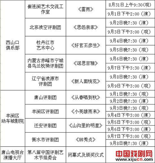 据组委会介绍,第八届中国评剧艺术节将于2012年8月31日至9月10日在唐山隆重举行。十八部戏剧将在四个剧院上演。演出剧院和时间表如下: