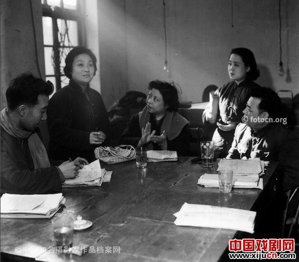 1962年,辛翠霞(左二)、杨兰芬(中)、李文房(右二)、刘文清院长(右一)和孔光山导演(左)正在排练现代歌谣刘胡兰。